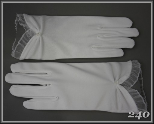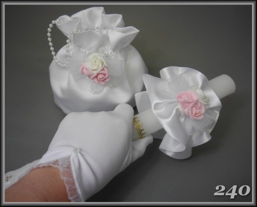 Komplet komunijny: torebka w kształcie woreczka satynowa ozdobiona koronkową aplikacją z kolorową przypinką, rękawiczki, okapnik satynowy. Do kompletu można dopasować wianek lub opaskę dostępną na naszych pozostałych aukcjach. Produkt Polski