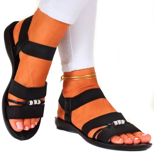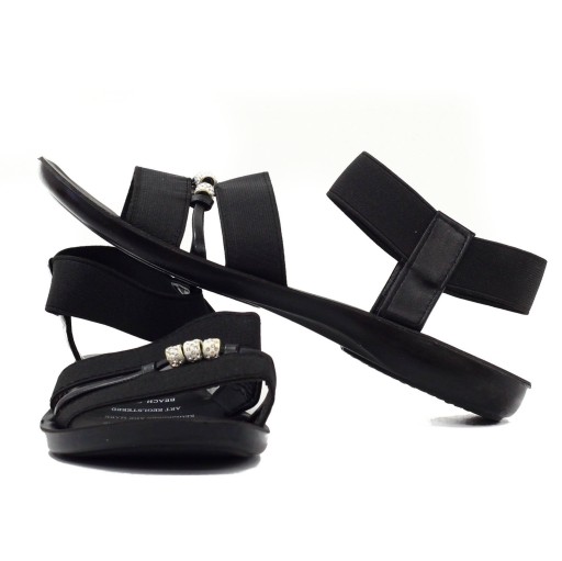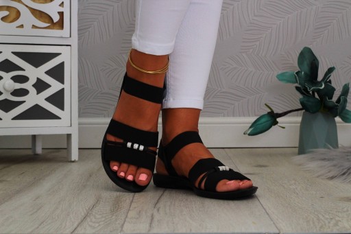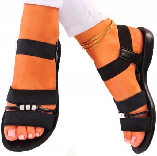 Damskie sandałki w kolorze czarnym na płaskiej podeszwie. Idealnie sprawdzą się jako obuwie na co dzień w letnie, upalne dni. Prosty fason dopasuje się również do eleganckich stylizacji a ozdobne koraliki dodadzą uroku każdej stylizacji. Elastyczny pasek przy kostce oraz śródstopiu ułatwia zakładanie obuwia i ułatwia jego dopasowanie do stopy.