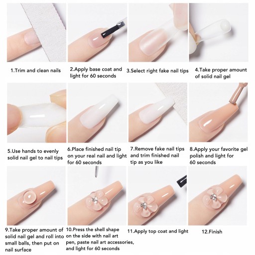 1. Nail Art Solid Gel: Jasny kolor i nieprzywierający, odpowiedni do różnych zdobienia paznokci, może służyć do mocowania akcesoriów do zdobienia paznokci, do kształtowania, rzeźbienia lub rzeźbienia do zdobienia paznokci.