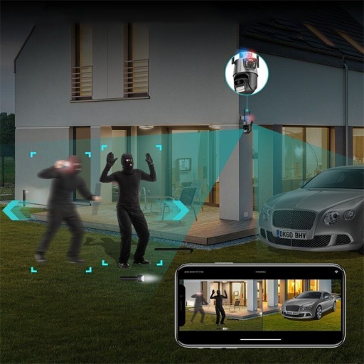 Dzięki technologii AI kamera może podążać za aktywnymi urządzeniami, jednocześnie ich nagrywając i wysyłając połączenie lub wejście do twojego telefonu. Maszyna będzie emitować czerwone i niebieskie światła oraz syreny, aby odpędzić napływające urządzenia.
