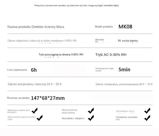 ✅ DANE TECHNICZNEWymiary: 147 x 68 x 27 mmWaga: 0.13 kgCzas pracy na baterii: 6hTemperatura robocza: -10℃ 50℃Temperatura przechowywania: -20℃ 70℃Bateria: 1 x 9VMaksymalna głębokość wykrywania:Metale żelazne: 100mmMetale nie żelazne (np. miedź): 80mmPrzewody pod napięciem**: 50mmDrewno: 20mmAutomatyczne wyłączanie przy bezczynności: 5min