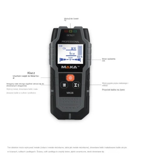 Wykrywacz przewodów MAKA przeznaczony jest do wykrywania metali wykonanych z żelaza i nie tylko np. prętów zbrojeniowych, legarów i "przewodów pod napięciem" w ścianach, sufitach oraz podłogach.