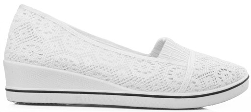 Balerinki koronkowe, w kolorze białym wykonane z materiały tkaninowego. Podeszwa to tworzywo gumowe. Obuwie na wygodnym koturnie.