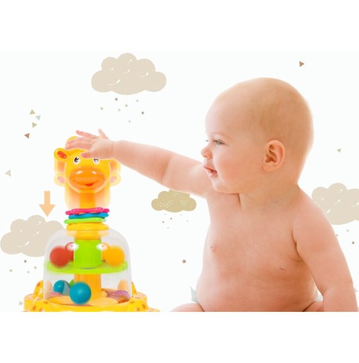 Dziecko może dotykać 3 kolorowych obręczy na szyi żyrafki, obracać nimi, poruszać w górę i w dół. W ten sposób uczy się nazywać kolory i poznaje nowe kształty, jakimi są koło, kwadrat i gwiazdka. W przezroczystym brzuszku żyrafy znajdują się dwa kolorowe piętra z motywami liści i kwiatów. Na każdym z nich umieszczono po dwie piłeczki, wszystkie w innych kolorach. Zabawka nabiera mocy za pomocą jednego ruchu! Wystarczy z niedużą siłą nacisnąć na głowę zwierzęcia a piłki w środku zaczną się obracać i podskakiwać. To bardzo proste, przez co napełniające dziecko radością!