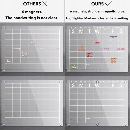- MAGNETYCZNE, NIE WYMAGA WIERCENIA: 6 potężnych, bardzo grubych magnesów o średnicy 0,12 cala pozwala akrylowemu kalendarzowi bezpiecznie przylegać do metalowych powierzchni i większości lodówek; ta wymazywalna tablica nigdy się nie ześlizgnie ani nie uszkodzi lodówki (nie dotyczy powierzchni ze stali nierdzewnej)