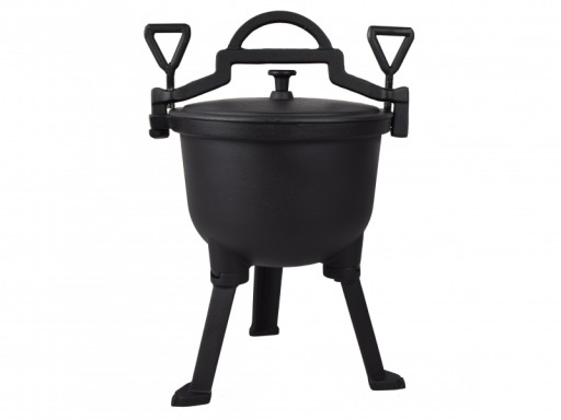 Kociołek myśliwski wyprodukowany z wysokiej jakości żeliwa w Polsce, starannie wykończony i wypalany w wysokiej temperaturze, co ma wpływ na jego odporność i czynniki klimatyczne.