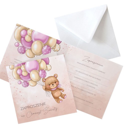 - KOMPLET: 10szt zaproszeń na Chrzest dziewczynki oraz 10szt dopasowanych kopert; zaproszenia udekorowane UROCZĄ GRAFIKĄ MISIA Z BALONIKAMI w różowym kolorze