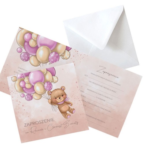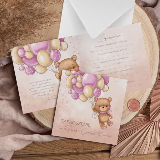 - zaproszenia z misiem i balonikami wykonane w odcieniach różu pozwolą zaprosić gości na Chrzest i Roczek dziewczynki
