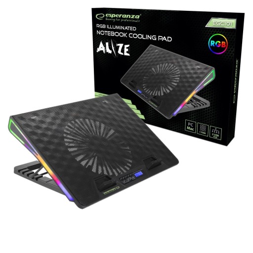 Cienka, nowoczesna i stylowa, podświetlana LED RGB, podstawka chłodząca pod notebooka. Posiada wbudowany niezwykle cichy wentylator. Usuwa on ciepło wytwarzane pod spodem notebooka, chłodząc go i obniżając temperaturę pracy jego podzespołów co zapewnia stabilną pracę oraz dłuższą żywotność baterii. Solidnie wykonana, wytrzymała konstrukcja z łatwością utrzymuje ciężar notebooka. Nie wymaga zewnętrznych źródeł zasilania – zasilana z portu USB notebooka. Nie wymaga instalacji. Trwała, wygodna i łatwa w przenoszeniu. Kompatybilna ze wszystkimi rodzajami notebooków.