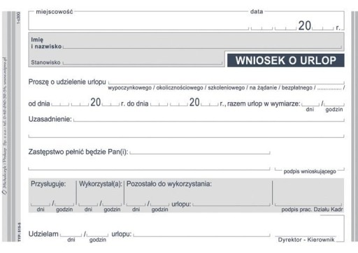 515-5 WNIOSEK O URLOP format: A6 rodzaj papieru: offsetowy zastosowanie: druki kadrowe oprawa: bloczek 40 kartek druk: jednostronny