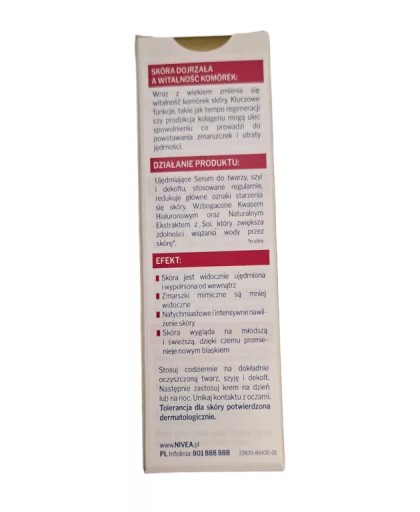 NIVEA VITAL SOJA Ujędrniające serum dla skóry dojrzałej. Ujędrniające Serum do twarzy, szyi i dekoltu, stosowane regularnie, redukuje główne oznaki starzenia się skóry. Wzbogacone Kwasem Hialuronowym i Ekstraktem z Soi, który zwiększa zdolności wiązania wody przez skórę. W efekcie skóra jest widocznie ujędrniona i wypełniona od wewnątrz, zmarszczki mimiczne są mniej widoczne, a skóra wygląda na młodszą i świeższą, dzięki czemu promienieje nowym blaskiem. Dodatkowo, serum natychmiastowo i intensywnie nawilża skórę. Unikaj kontaktu z oczami. Tolerancja dla skóry jest potwierdzona dermatologicznie.