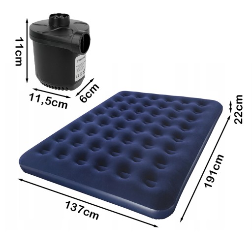 - Wymiary materaca po nadmuchaniu (dł/szer/wys): 191 x 137 x 22cm