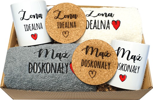 Hafty na ręcznikach, grawery na podkładkach oraz nadruki na kubkach są stałe (mąż doskonały oraz żona idealna) i nie podlegają modyfikacjom.
