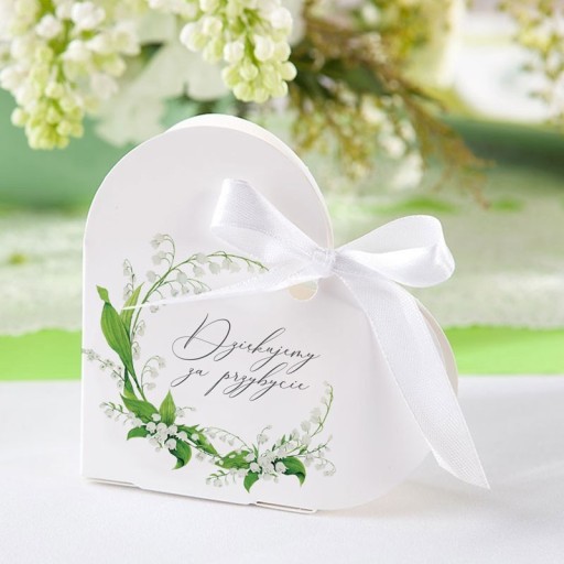Pudełeczka serduszka na upominki dla gości komunijnych to wspaniały pomysł na podziękowanie im za obecność w tak ważnej uroczystości dla dziecka. Posiadają dekoracyjny nadruk wianuszka z konwalii wraz z napisami "Pierwsza Komunia Święta" i "Dziękujemy za przybycie". Pudełka należy samodzielnie złożyć i przewiązać białymi wstążkami dołączonymi do zestawu. W środku można umieścić drobne cukierki lub bakalie.