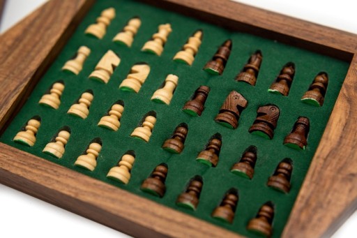 Szachy magnetyczne w ośmiokątnym pudełku – G236Szachy magnetyczne w ośmiokątnym pudełku to mobilna wersja królewskiej gry. Możesz je zabrać w podróż i trenować debiuty w trasie. Magnetyczne bierki trzymają się szachownicy, co poprawia komfort rozgrywki. Szachownica znajduje się na topie ośmiokątnego pudełka. Pudełko z szufladką na bierki ułatwia ich bezpieczne przechowywanie. Szachownica:·Wymiary szachownicy: ·Wymiary pudełka: 15 x 15 cm·Szachownica z szufladką na bierki·Szachownica drewniana: palisander indyjski ·Kolory: brąz i beżBierki szachowe:·Bierki wykonane z drewna: palisander indyjski ·Kolory: brąz i beż·Bierki magnetyczne – trzymają się szachownicy·Bierki podklejone materiałem·16 bierek brązowych – 8 pionów + 8 figur·16 bierek beżowych – 8 pionów + 8 figur Wymiary: wysokość króla: 2 cm·wysokość hetmana: 1,8 cm·wysokość gońca: 1,7 cm·wysokość skoczka: 1,5 cm·wysokość wieży: 1,4 cm·wysokość piona: 1,2 cm
