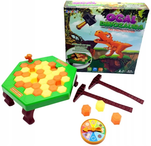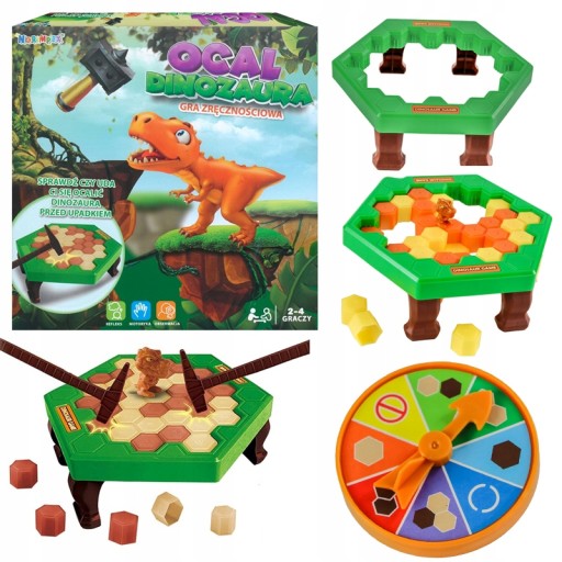 Gra ćwicząca zręczność i refleks. Za pomocą młoteczka dziecko wystukuje kamienie ułożone na blacie stołu, na którym po środku ustawia dinozaura. Na kole fortuny wylosuj swój ruch i wystukaj go na stoliczku. Uwaga! Nie wpadnij w pułapkę przeciwnika! Gracz którem zapadnie się dinozaur przegrywa!