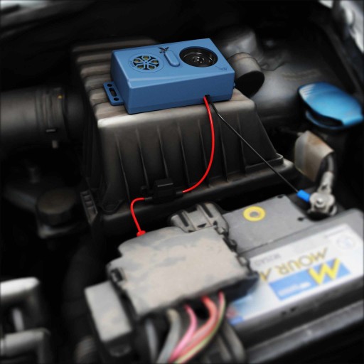 Samochodowy ultradźwiękowy odstraszacz kun marki BIELIK®. Skutecznie odstrasza zwierzęta takie jak kuny, łasice, szczury czy myszy przed wtargnięciem pod maskę samochodu.