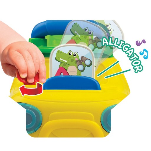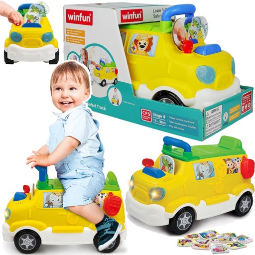 Interaktywny pojazd ma 13 plastikowych dwustronnych kart z wizerunkiem 26 zwierzątek i literkami.