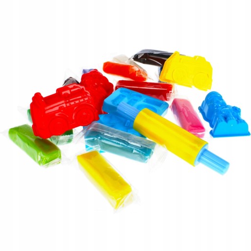 Zawartość zestawu: 12 kolorów mas plastycznych, 4 x foremki, wałek do rozwałkowania masy, 12 woreczków, mata do podłożenia.