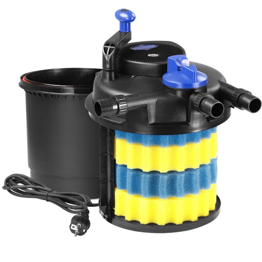 Filtr ciśnieniowy do oczka wodnego z pompą zapewnia stabilną równowagę biologiczną w oczku wodnym i poprawia jakość wody. Osiąga się to dzięki połączeniu gąbek filtracyjnych (brak w zestawie)i technologii UV-C. Zmienia to trzeciorzędowe i czwartorzędowe struktury białek glonów. Glony zlepiają się, tworząc większe cząsteczki i mogą być łatwo usunięte z obiegu wody poprzez mechaniczną filtrację stawu.