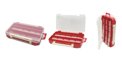 Pudełko dwustronne na akcesoria wędkarskie i sztuczne przynęty takie jak: woblery, obrotówki, wahadłówki i twistery. Wykonane z polipropylenu, materiału bezpiecznego w kontakcie z przynętami sztucznymi.