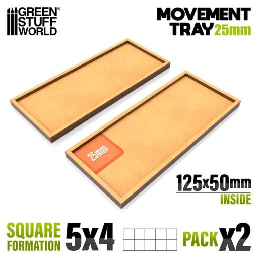 Each unit allows multiple combinations of squared or rectangular-based miniatures. For example, 10x 25mm, or 5x 25mm and 1x 50mm, or 2x 25mm and 2x 50mm.