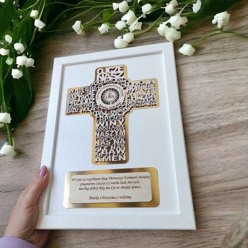 - krzyż z modlitwą oraz personalizacją wycięty jest metodą laserową ze sklejki 3mm i umieszczony na złotym, lustrzanym podkładzie co daje przepiękny efekt