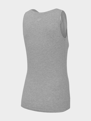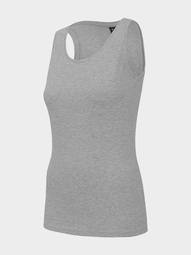 Top damski jest wykonany w 85% z bawełny, dzięki czemu jest miękki, trwały i przyjemny w dotyku. Dzięki dodatkowi wiskozy (10%) materiał jest bardzo przyjemny w dotyku, a do tego lekki i zwiewny oraz dobrze układa się na sylwetce. Okrągły dekolt jest zakończony lekkim ribowaniem. Szersze ramiączka bez regulacji.
