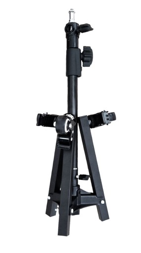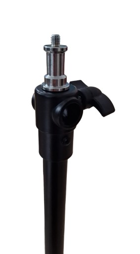 ◇ Statyw wyposażony jest w kółka o średnicy 38 mm, ułatwiające płynne przemieszczanie się z zamontowaną lampą i softboxem. Dodatkowo wbudowany hamulec zapewnia stabilność podczas pracy. Metalowa głowica umożliwia montaż trzpienia zarówno w pozycji pionowej, jak i poziomej, dzięki czemu można osiągnąć różnorodne ustawienia oświetlenia. Trzpień jest odwracalny i wyposażony w dwa punkty montażowe: 1/4” i 3/8”. Nogi wykonane są z solidnych profili, z możliwością składania do pozycji pionowej, a jedna z nich posiada śrubę umożliwiającą regulację kąta pochylenia i wypoziomowanie statywu.