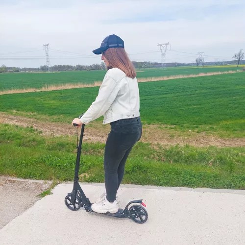 Hulajnoga to nie tylko pojazd służący do zabawy, ale także coraz bardziej popularny, ekologiczny środek transportu. Składana hulajnoga może być stosowana zarówno przez dzieci, jak i dorosłych. Duża średnica kół sprawia, że łatwo się nią jeździ, a dodatkowo szybko rozwija znaczną prędkość. Gumowe koła sprawiają, że jazda na niej jest komfortowa. Są zwrotne i bardzo łatwo się prowadzą, gwarantują dobrą przyczepność i amortyzują drobne nierówności znajdujące się na drodze. Hulajnoga posiada także nóżkę, która umożliwia pozostawienie jej w pozycji stojącej. Nie tylko ułatwia to korzystanie z niej, ale sprawia również, że pojazd jest mniej podatny na różnego rodzaju uszkodzenia, które mogą powstać, kiedy leży na ziemi bądź opiera się o ściany czy inne przedmioty. Regulowana kierownica hulajnogi gwarantuje dostosowanie jej do wysokości użytkownika. Podwójna blokada kierownicy zabezpiecza ją przed niekontrolowanym rozluźnieniem nawet podczas szybkiej jazdy po nierównościach. Metalowe zatrzaski pozwalają na regulację wysokości na 3 poziomach, a szybko-zamykacz stabilnie mocuje kierownicę w wybranej pozycji. Błotnik nad tylnym kołem służy także jako hamulec. Szeroka platforma główna zapewnia zajęcie bezpiecznej i komfortowej pozycji. Wpływa to na łatwość jazdy na hulajnodze, a także podnosi efektywność rozpędzania się poprzez odpychanie, które może być bardziej dynamiczne, jeżeli druga noga ma stabilne oparcie. Hulajnoga jest bardzo łatwa w montażu. Wystarczy wyciągnąć ją z pudełka, włożyć rączki do kierownicy, rozłożyć całą konstrukcję za pomocą jednej dźwigni i można od razu zacząć jeździć.