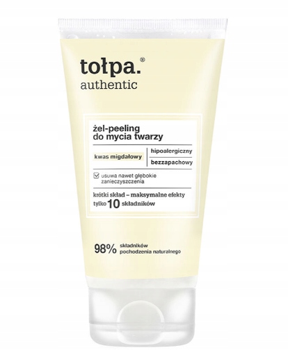 Tołpa - Authentic - Żel-Peeling do Mycia Twarzy - oczyszcza i jednocześnie intensywnie pielęgnuje, dzięki obecności kwasu migdałowego. Usuwa zrogowaciały naskórek i najdrobniejsze zanieczyszczenia z zachowaniem naturalnej równowagi: mikrobiomu, fizjologicznego pH i bariery hydrolipidowej. Skóra jest oczyszczona, gładka i nawilżona.