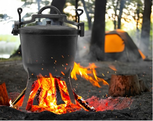 Kociołek może stać bezpośrednio w ognisku, a dzięki poręcznemu uchwytowi może być zawieszony również nad ogniskiem.