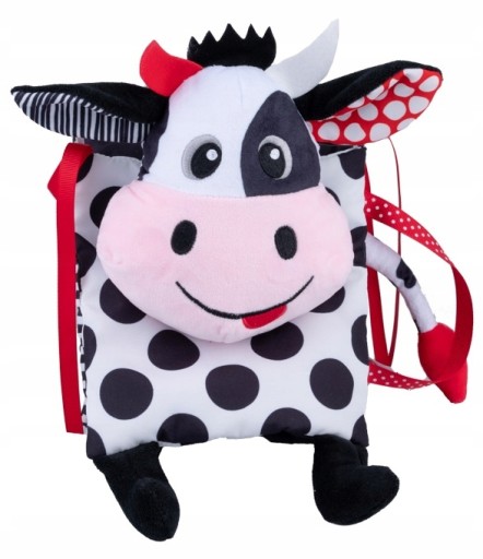 Sensoryczna, miękka, szeleszcząca książeczka z podobizną krowy sprawdzi się idealnie zarówno w domu, jak i w podróży.