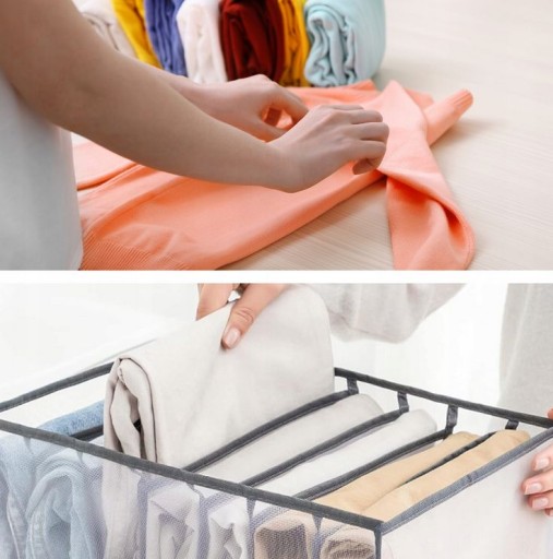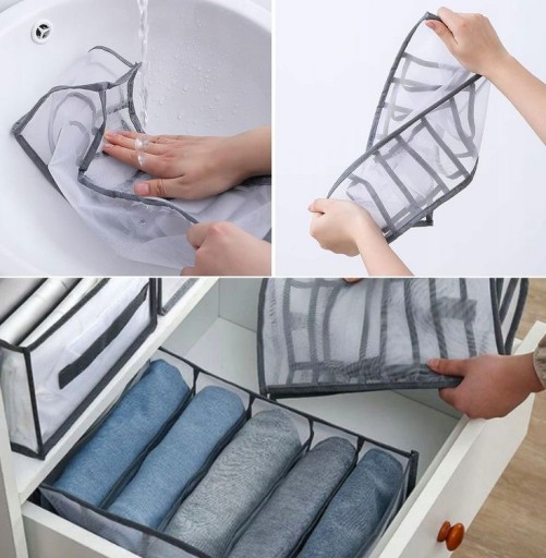 Siatkowe organizery mają 7 przegród i świetnie nadają się do przechowywania spodni, jeansów, legginsów, t-shirtów, koszul, spódnic, szalików czy ubrań dziecięcych. Dodatkowo łatwość ich składania umożliwia używanie ich w podróży i łatwe przenoszenie.