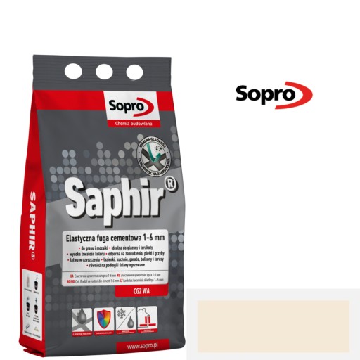 Sopro Saphir® jest cementową, elastyczną, o wysokiej odporności na wnikanie wody i zabrudzenia zaprawą fugową, która spełnia wymagania CG2 WA zgodnie z normą PN-EN 13888. Jest łatwa w obróbce, posiada szczególnie dobre właściwości zmywalne. Cechy te w połączeniu z delikatną, gładką i łatwą w pielęgnacji powierzchnią, jak i podwyższoną trwałością koloru wpływają na długo utrzymujący się estetyczny wygląd fugi.
