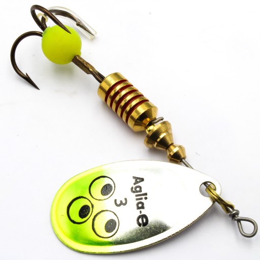 Projektując Aglię -e, wykorzystano zjawisko fluorescencji pod wpływem niewidzialnych dla ludzkiego oka promieni UV (ultrafioletowych). Paletka Aglii, pokryta została powłoką zawierającą pigment czuły na promienie UV, dzięki czemu na dużych głębokościach Aglia -e odbijając promienie UV, jest znakomicie widoczna i prowokuje drapieżnika do ataku i to w chwili, gdy inne przynęty stają się praktycznie niezauważalne. Na kotwiczce umieszczona jest kulka wykonana z miękkiego tworzywa, która imituje najbardziej pożądany przez ryby wszystkich gatunków pokarm, czyli ikrę. Kulka ta również odbija promienie UV i działa na dużych głębokościach jak reflektor wskazujący drapieżnikom drogę do celu.