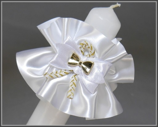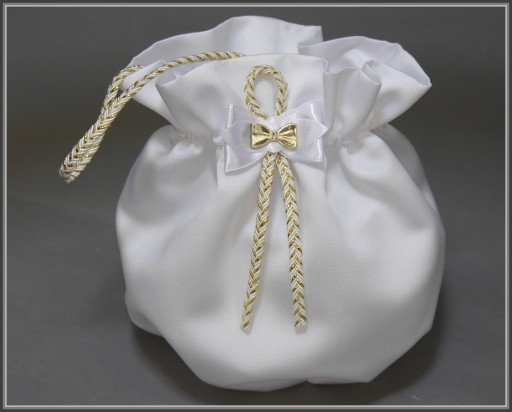 Komplet komunijny. Okapnik, torebka i rękawiczki pięciopalczaste idealny do alby ozdobionej złoty akcentem. Torebka wykonana została z satyny ślubnej pierwszego gatunku i ozdobiona złotą kokardką i śliczną biało-złotą plecioną rączką. Na pozostałych aukcjach można kupić każdy produkt osobno. Na życzenie możemy przygotować rękawiczki zakładane na jeden paluszek