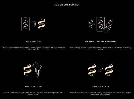 - Światło: zmienne (zmiana programów i efektów poprzez aplikacje mobilną Twinkly)