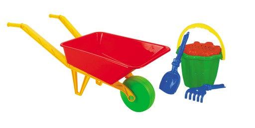 - Duża taczka do zabawy z akcesoriami: wiaderkiem, sitkiem, łopatką, grabkami