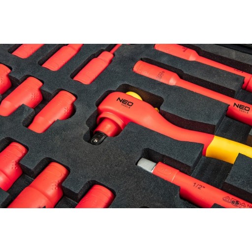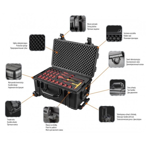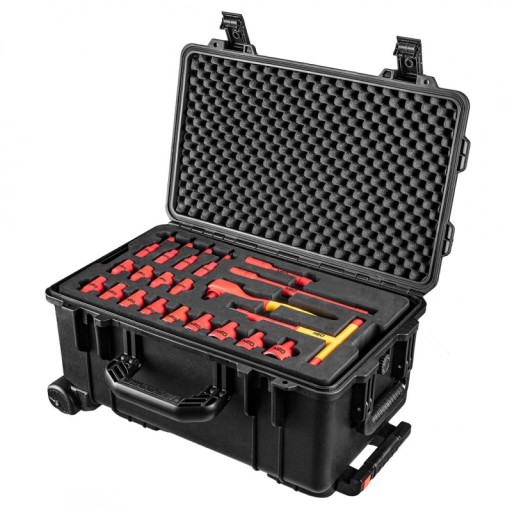 Skrzynia serwisowa elektryka (nr ref. 01-311) to kompleksowy pięćdziesięcio dwu elementowy zestaw z szeregiem najbardziej przydatnych narzędzi elektrycznych zamkniętych w 22" mocnej skrzyni. Skrzynia wykonana z wytrzymałego polipropylenu przygotowana jest na najtrudniejsze warunki pewnie zabezpieczając drogie narzędzia. Posiada odporny na wstrząsy i obicia mocny korpus o grubych ścianach. Jest wodo i pyło-odporna o klasyfikacji IP67. Zaopatrzona w zawór ciśnieniowy utrzymujący balans między wewnętrznym i zewnętrznym ciśnieniem. Sprawia to, że można z nią podróżować na różnych poziomach wysokości. Dzięki wodoszczelnej uszczelce o-ring i podwójnemu zamknięciu walizka jest bardzo szczelna. Dla lepszego komfortu wyposażona została w dwa uchwyty (do noszenia pionowego i poziomego) a także w uchwyt teleskopowy i koła jeszcze bardziej zapewniając łatwość transportu. Wyposażona w 4 piankowe wkłady zawierające narzędzia certyfikowane atestem 1000V wg standardu IEC60900.