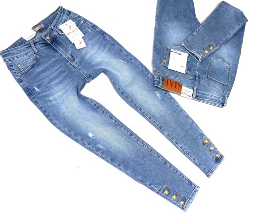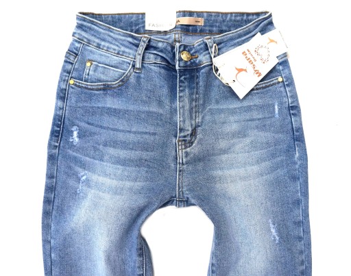 - nogawki zwężane ku dołowi, dopasowane typu rurki, lekko przecierane z małymi dziurami