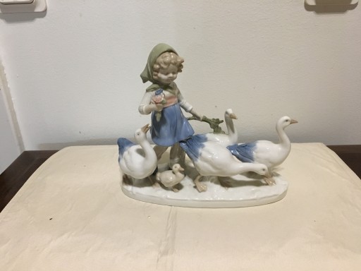 Piekna stara figurka kobiety z gaskami bez uszkodzen,sygnowana . Wysokosc 18,5cm, dlugosc 21cm.
