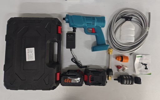 🪣 Pistolet do myjki ciśnieniowej jest wyposażony w akumulator litowy o dużej pojemności 48 V, który nie wymaga kabli i jest łatwy do przenoszenia.