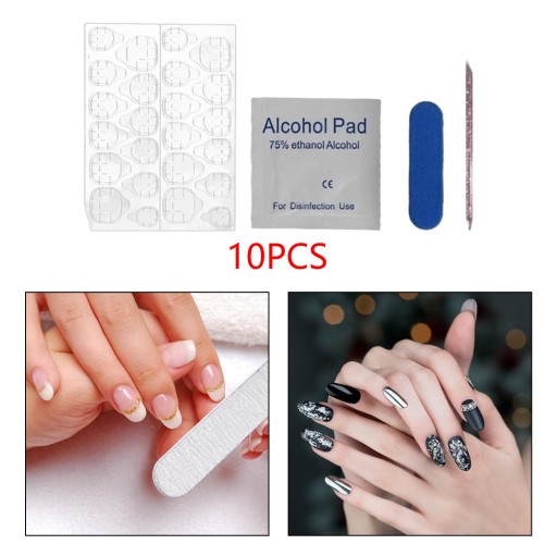 [Pakiet zawiera] 10 niebieskich pasków do wycierania, podkładkę, drewniany patyczek, 10 arkuszy dwustronnego kleju do paznokci (24 tabletki na arkusz). Świetny klej do paznokci, nie zaszkodzi łożysku paznokcia.