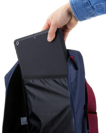 Plecak został wyposażony w możliwość szybkiego odpinania szelek i umożliwienia komfortowego nałożenia na rączkę walizki.