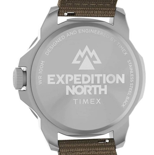 Sportowy męski młodzieżowy wodoszczelny zegarek TIMEX Expedition North Ridge TW2V62400 - metalowa koperta w kolorze srebrnym, beżowy materiałowy pasek, brązowa tarcza. Podświetlane cyfry. Datownik. Klasa szczelności 100M