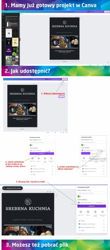 1️⃣ Kliknij przycisk UDOSTĘPNIJ w kreatorze CANVA (prawy górny róg strony jak na grafice obok)