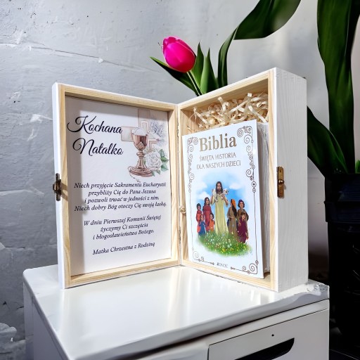 - na zewnątrz oraz w środku posiada efektowną dedykacją na Komunię, wykonaną metodą trwałego nadruku uv, które będzie oryginalnym i wyjątkowym, personalizowanym prezentem