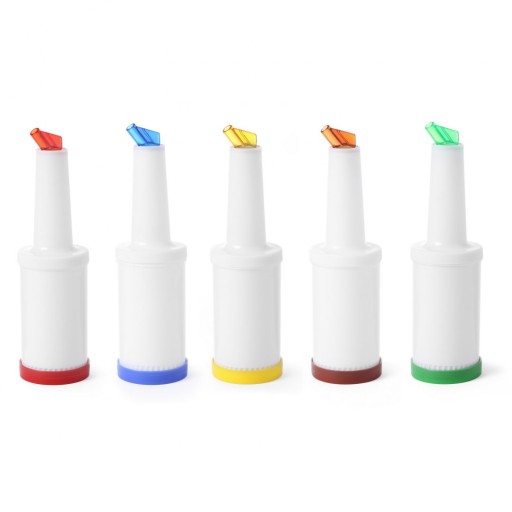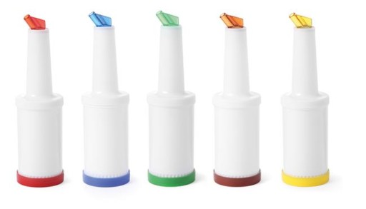 Przeznaczony do dozowania, mieszania i przechowywania wszelkich płynnych dodatków Wykonany z polipropylenu i polistyrenu Końcówka zapewnia równomierny strumień nalewania płynnych dodatków dzięki odpowietrznikowi Dyspenser łatwo rozłożyć na części Szyjkę butelki można zastąpić nakrętką, która pełni funkcję podstawki co pozwala szczelnie zamknąć zawartość pojemnika na czas jego przechowywania Dostarczany z 5 kolorowymi końcówkami do nalewania w kolorach: czerwonym, niebieskim, zielonym, pomarańczowym i żółtym Nadaje się do mycia w zmywarkach