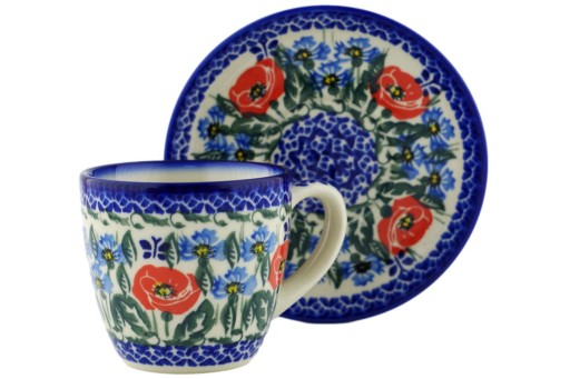 Ręcznie zdobione filiżanki i podstawki wytwarzane przy użyciu tradycyjnej bolesławieckiej metody zdobienia stemplami oraz pędzlami.